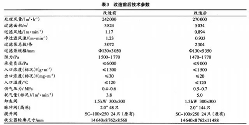 但我廠由于受場地限制,空間狹窄,無法采用第一種方案,只能采用第二種方案,即收塵器加高方案。改造后的技術參數見表3。