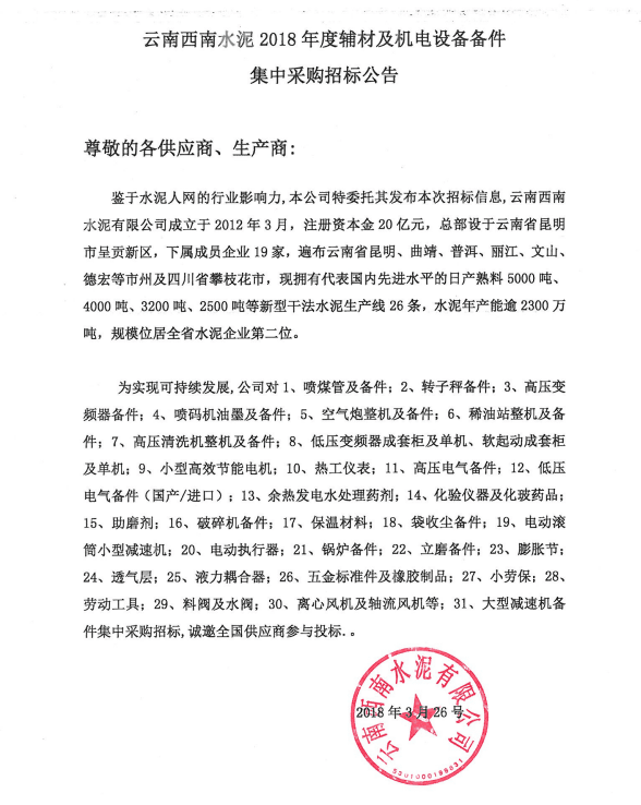 鑒于水泥人網(wǎng)的行業(yè)影響力,本公司特委托其發(fā)布本次招標(biāo)信息,云南西南水泥有限公司成立于2012年3月,注冊資本金20億元,總部設(shè)于云南省昆明市呈貢新區(qū),下屬成員企業(yè)19家,遍布云南省昆明、曲靖、普洱、麗江、文山、德宏等市州及四川省攀枝花市,現(xiàn)擁有代表國內(nèi)先進(jìn)水平的日產(chǎn)熟料5000噸、4000噸、3200噸、2500噸等新型干法水泥生產(chǎn)線26條,水泥年產(chǎn)能逾2300萬噸,規(guī)模位居全省水泥企業(yè)第二位。