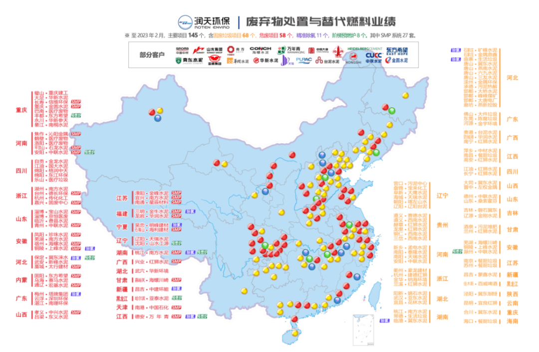 除萬年青集團外,潤天環保還為中國建材、海螺水泥、金隅冀東、紅獅水泥、臺灣水泥、亞洲水泥、金圓水泥等各大水泥集團落地了危廢協同處置等多個項目。經多家水泥企業實踐證明,潤天環保相關技術有效推動了危廢處置增產、煤耗下降達標和水泥窯替代燃料高效利用,同時可以利用工業廢料和垃圾等制備RDF替代燃料,具有高適應性、高可靠性、高燃燒率等優勢。