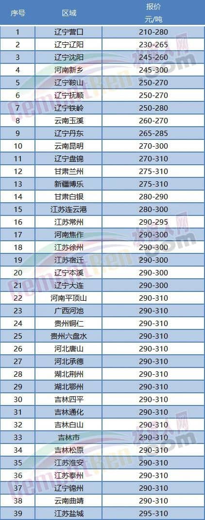 吉林四平、通化、白山、松原,湖北荊州、鄂州,河北唐山、承德,貴州省內銅仁、六盤水,廣西河池等區域報價在290-310元/噸。