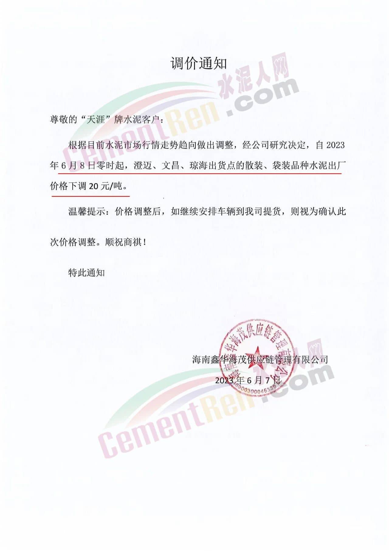 海南鑫華海茂供應鏈管理有限公司通知根據目前水泥市場行情走勢趨向做出調整,經公司研究決定,自2023年6月8日零時起,澄邁、文昌、瓊海出貨點的散裝、袋裝品種水泥出廠價格下調20元/噸。