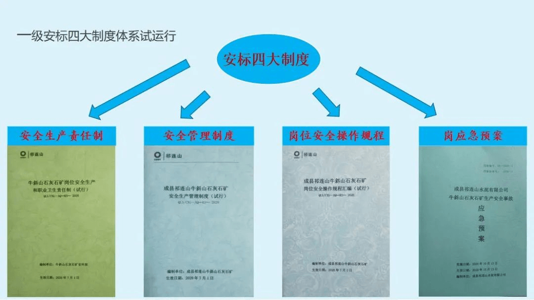 成縣分公司于2014年開展礦山安全生產(chǎn)標(biāo)準(zhǔn)化創(chuàng)建工作,于2016年1月通過二級礦山安全生產(chǎn)標(biāo)準(zhǔn)化并授牌,持續(xù)通過復(fù)評授牌。2019年11月啟動礦山一級安全生產(chǎn)標(biāo)準(zhǔn)化創(chuàng)建工作,已完成四大體系文件建設(shè):管理制度80個、安全生產(chǎn)責(zé)任制58項、安全操作規(guī)程70項、綜合應(yīng)急預(yù)案一章、專項應(yīng)急預(yù)案7章、現(xiàn)場處置方案9章、已完成備案并持續(xù)運行,崗位達標(biāo)工作持續(xù)開展。