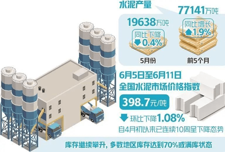 進入6月以來,受降雨、工程項目資金緊張等因素影響,水泥成交量大幅下滑,各企業庫存壓力增大。全國水泥庫容比達75.81%,部分區域企業庫存達到100%。