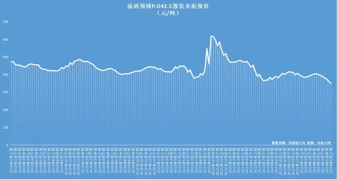 圖:流通領域P.O42.5散裝水泥自2023年5月下旬創造近5年市場最低價以后,6月上旬再破最低價紀錄。
