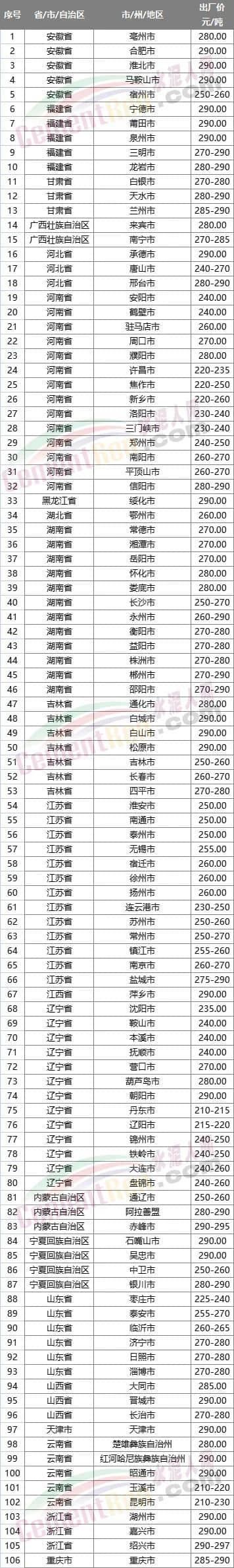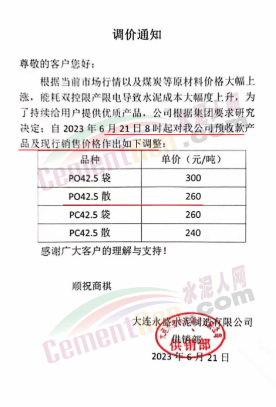 大連永盛水泥制造有限公司通知稱,根據當前市場行情以及煤炭等原材料價格大幅上漲,能耗雙控限產限電導致水泥成本大幅度上升,為了持續給用戶提供優質產品,公司根據集團要求研究決定,自2023年6月21日8時起對公司預收款產品及現行銷售價格作出如下調整。調整后PO42.5散報價260元/噸。