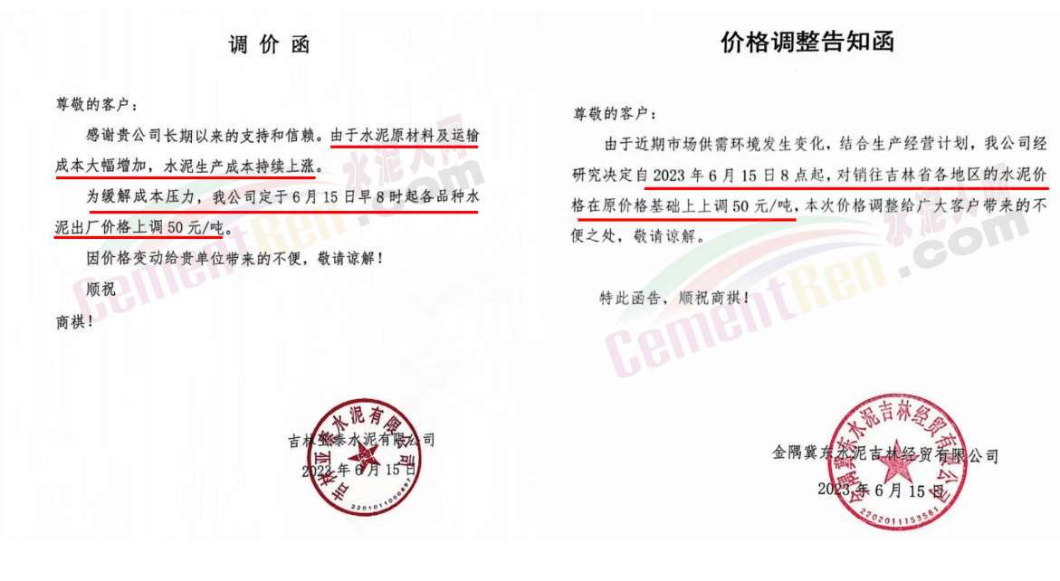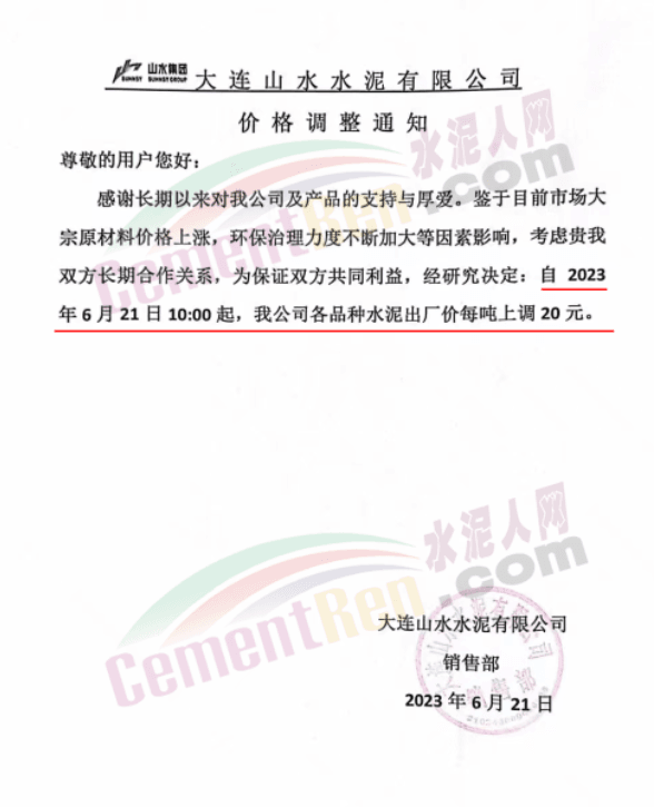 大連山水水泥有限公司價格調整通知稱,鑒于目前市場大宗原材料價格上漲,環保治理力度不斷加大等因素影響,經研究決定,自 2023年6月21日10時起,公司各品種水泥出廠價每噸上調20元。