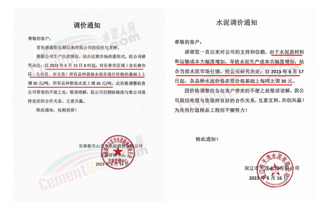 吉林市場亞泰水泥、金隅冀東、北方水泥、天茂水泥等通知上調水泥價格30-50元/噸。