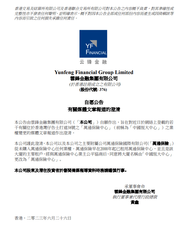 至此,外界猜測(cè)相關(guān)業(yè)權(quán)也作出變更。6月26日,云鋒金融集團(tuán)對(duì)此傳聞作出澄清。公告稱,公司及公司之非全資附屬公司萬(wàn)通保險(xiǎn)國(guó)際有限公司從未購(gòu)入萬(wàn)通保險(xiǎn)中心(原中國(guó)恒大中心)任何業(yè)權(quán)。