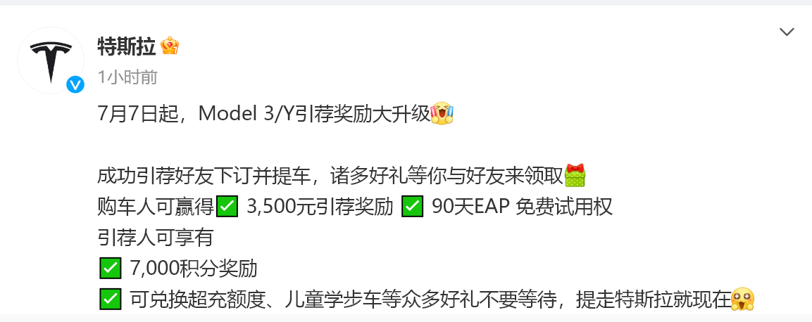 雖然中國汽車工業協會發布聲明從承諾書中刪除涉及“價格”表述,但在一些行業人士看來,價格戰是商業主體競爭的市場行為,汽車行業也不例外,諷刺的是,剛剛簽訂了協議,新能源汽車領軍者特斯拉于簽訂協議次日(7日)變相降價,7月7日起升級Model 3/Y引薦獎勵。成功引薦好友下訂并提車,購車人可獲得3500元引薦獎勵(可用于抵扣車輛尾款),90天EAP免費試用權,引薦人可享7000積分獎勵、可兌換超充額度、兒童學步車等。