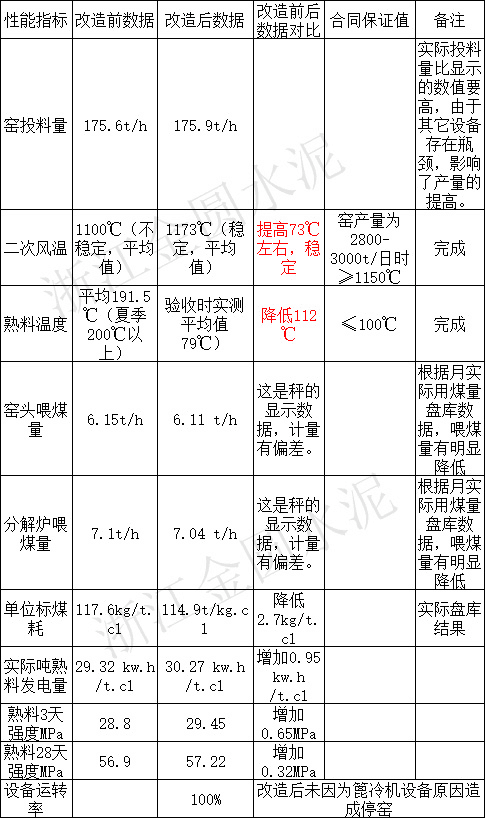 改造施工工程歷時30 天,經過一段時間的運行及調試消缺,該設備運轉正常,各工藝參數穩定,目前窯產量能連續穩定達到2800-3000T/D(因其它因素的影響,提產方面尚有瓶頸),取得的節能指標十分明顯。經金圓水泥設備部、生產部、安環部等大半年的運行評審與考核,所有改造的預期目標全部達到,實際運行指標均超過合同考核標準。