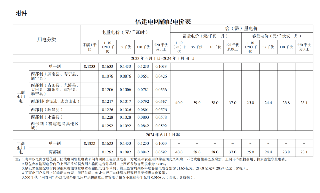 福建省發展和改革委員會發布《關于落實第三監管周期輸配電價有關事項的通知》 。新的省級電網輸配電價自2023年6月1日起執行,即全省工商業用戶6月份用電產生電費按最新電價政策執行。此次電價調整對象為全省工商業用戶,除執行居民生活和農業生產用電價格以外的用電。