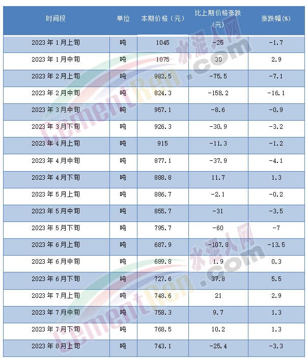 煤炭價(jià)格方面,繼6月中旬開始回暖后至8月上旬再次下滑25.4元/噸。市場貿(mào)易商表示,立秋之后天氣轉(zhuǎn)涼,電廠用煤量下降。同時(shí)遇水泥、鋼鐵等市場淡季,貿(mào)易商囤貨意愿不強(qiáng),煤價(jià)失去支撐回落。以山西大混(5000大卡)為例,2023年6月中旬持續(xù)5期連漲后,至2023年8月上旬回落25.4元/噸至743.1元/噸。