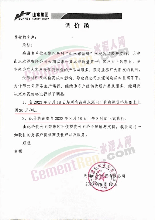 天津山水水泥有限公司通知稱,受原材料及運輸高成本影響,導致公司水泥制造成本居高不下。為保障公司正常生產運行,繼續為客戶提供優質產品及服務,經研究決定自2023年8月18日起所有品種水泥出廠價在原價格基礎上上調30元/噸。