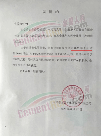 天津市金晟華水泥股份有限公司通知稱,由于市場變化等因素,經公司研究決定自2023年8月17日20:00時起,對PO42.5級水泥出廠價上調30元/噸。