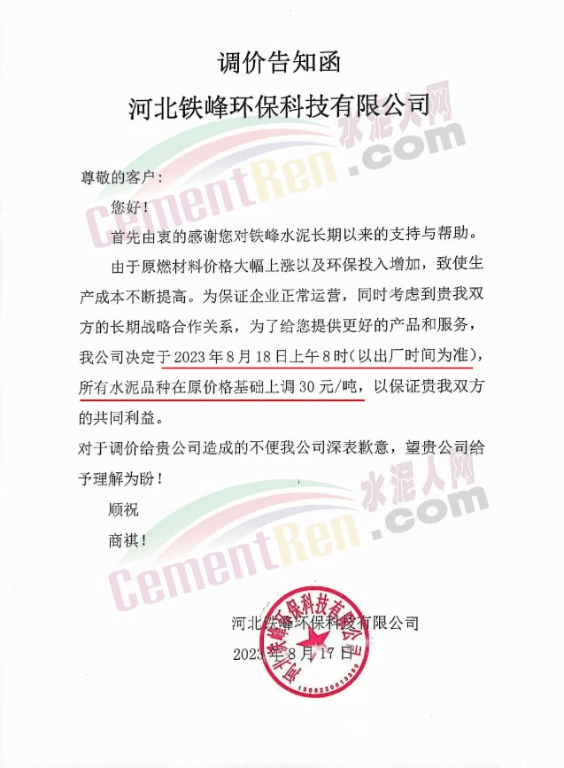 河北鐵峰環保科技有限公司通知稱,由于原燃材料價格大幅上漲以及環保投入增加,致使生產成本不斷提高。為保證企業正常運營,決定于2023年8月18日上午8時,所有水泥品種在原價格基礎上調30元/噸。