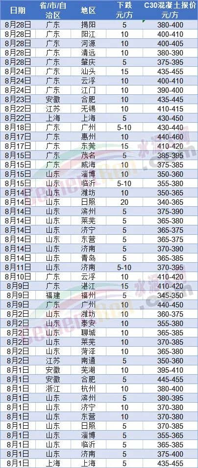 同期,下游商混企業被迫跟進下調報價,進入8月份以來廣東、山東、安徽、江蘇、浙江等多個區域商品混凝土報價下跌。其中山東區域下跌2-3輪,累計下跌10-25元/方;廣東多地混凝土價格下跌5-20元/方;其他區域多為5-15元/方不等的下跌。