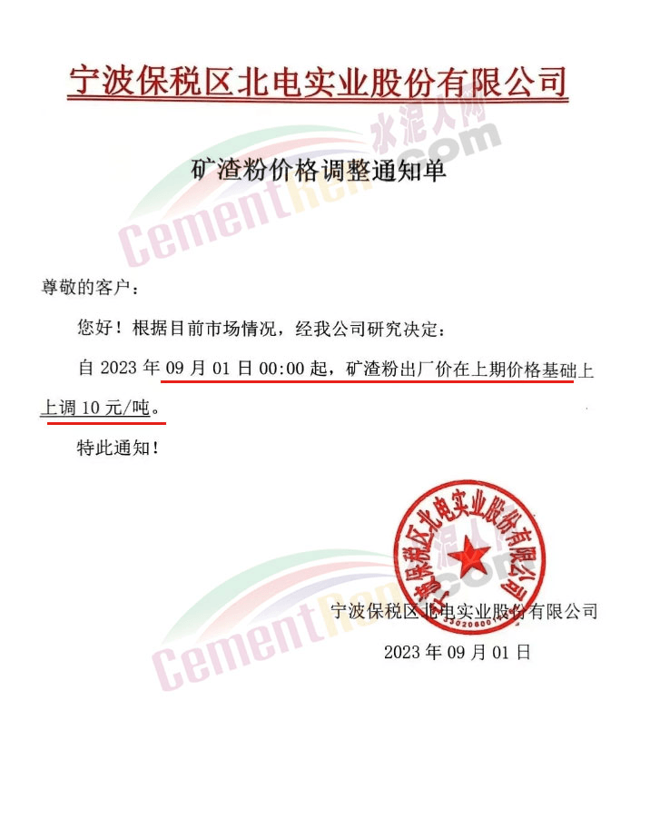 浙江寧波保稅區(qū)北電實業(yè)股份有限公司通知,根據(jù)目前市場情況,經(jīng)公司研究決定:自9月1日0時起,礦渣粉出廠價在上期價格基礎(chǔ)上上調(diào)10元/噸,上調(diào)后礦粉現(xiàn)金掛牌價210元/噸。
