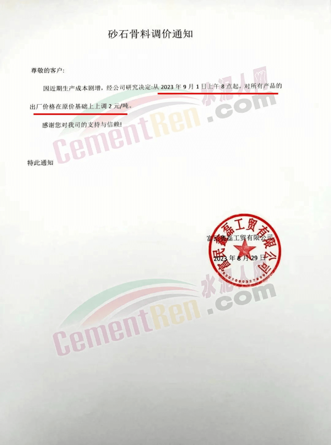 華新水泥(富民)有限公司通知稱,受電力供應緊張、環(huán)保投資及資源稅等影響,導致生產(chǎn)成本大幅度增加,經(jīng)公司慎重研究決定:自2023年9月1日8時起,公司所有品種骨料出廠價在原執(zhí)行價格基礎(chǔ)上上調(diào)2元/噸。