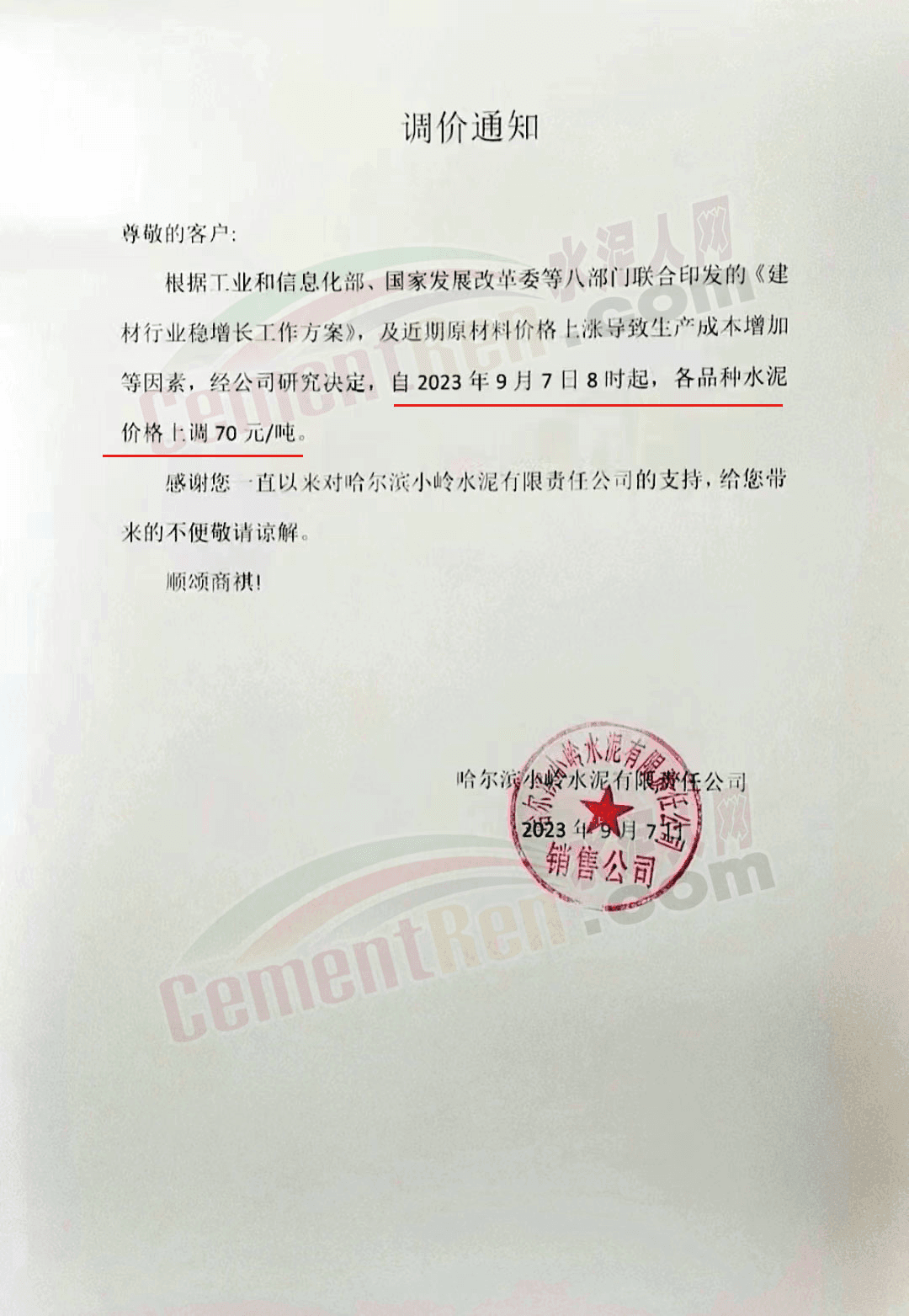 哈爾濱小嶺水泥有限責(zé)任公司通知,根據(jù)工業(yè)和信息化部、國(guó)家發(fā)展改革委等八部門(mén)聯(lián)合印發(fā)的《建材行業(yè)穩(wěn)增長(zhǎng)工作方案》,及近期原材料價(jià)格上漲導(dǎo)致生產(chǎn)成本增加等因素,經(jīng)公司研究決定,自2023年9月7日8時(shí)起,各品種水泥價(jià)格上調(diào)70元/噸。