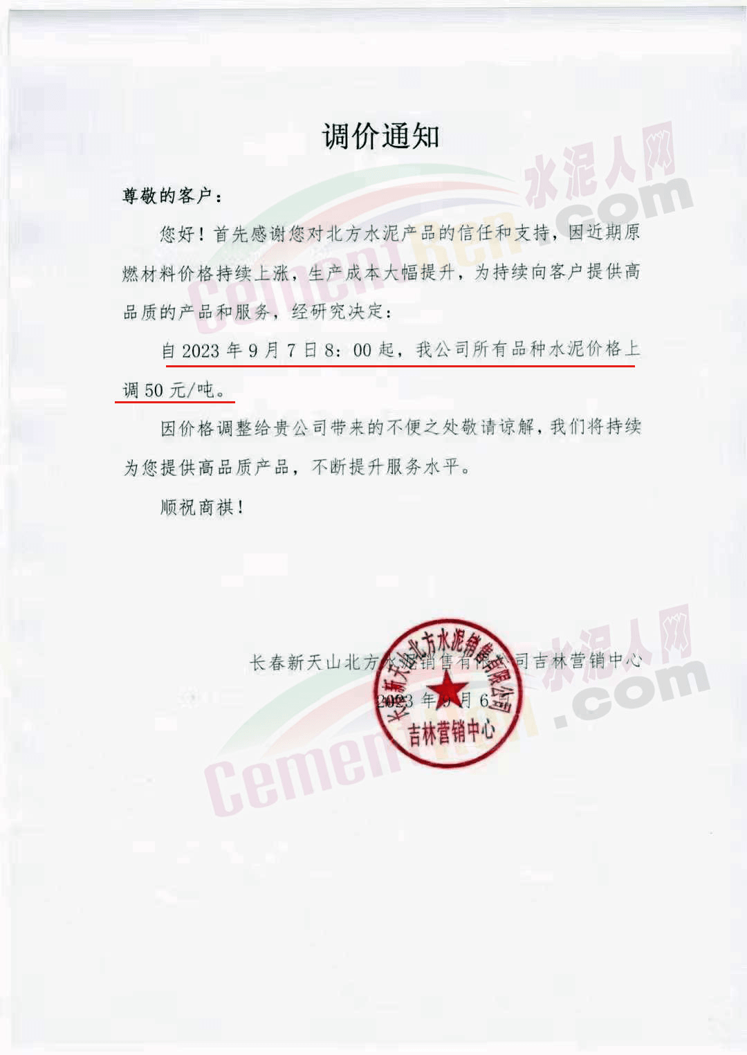 長(zhǎng)春新天山北方水泥銷(xiāo)售有限公司吉林營(yíng)銷(xiāo)中心通知,因近期原燃材料價(jià)格持續(xù)上漲,生產(chǎn)成本大幅提升,為持續(xù)向客戶(hù)提供高品質(zhì)的產(chǎn)品和服務(wù),經(jīng)研究決定:自2023年9月7日8時(shí)起,公司所有品種水泥價(jià)格上調(diào)50元/噸。