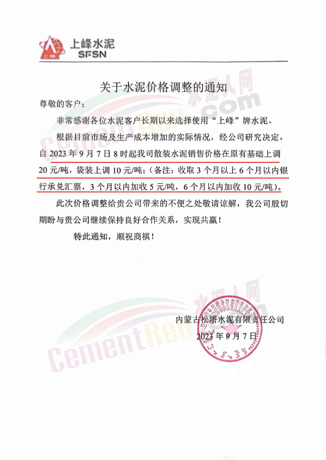 內(nèi)蒙古松塔水泥有限責(zé)任公司通知,根據(jù)目前市場(chǎng)及生產(chǎn)成本增加的實(shí)際情況,經(jīng)公司研究決定自2023年9月7日8時(shí)起散裝水泥銷(xiāo)售價(jià)格在原有基礎(chǔ)上調(diào)20元/噸,袋裝上調(diào)10元/噸;并提示,收取3個(gè)月以上6個(gè)月以?xún)?nèi)銀行承兌匯票,3個(gè)月以?xún)?nèi)加收5元/噸,6個(gè)月以?xún)?nèi)加收10元/噸。