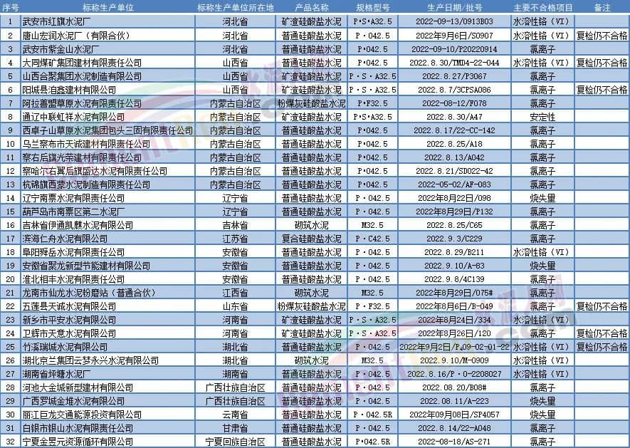 另據了解,4月6日,市場監管總局通報2022年建筑材料產品質量國家監督抽查情況顯示,共抽查28個省(區、市)961家企業生產的961批次水泥,發現32批次產品不合格,不合格項目涉及燒失量、氯離子、水溶性鉻(Ⅵ)、安定性等,其中8批次水溶性鉻和19批次氯離子不合格,在問題水泥中占比相對較高。