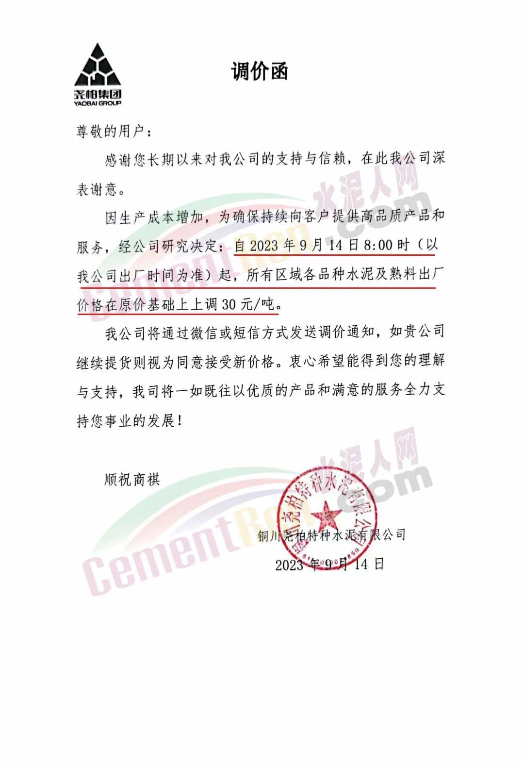 蒲城堯柏水泥通知,因生產(chǎn)成本增加,為保證持續(xù)向客戶提供高品質(zhì)產(chǎn)品和服務(wù),經(jīng)公司研究決定,所有品種水泥 (包含熟料)出廠價(jià)格在原價(jià)格基礎(chǔ)上上調(diào)30元/噸,自2023 年9月14日8時(shí)起執(zhí)行。