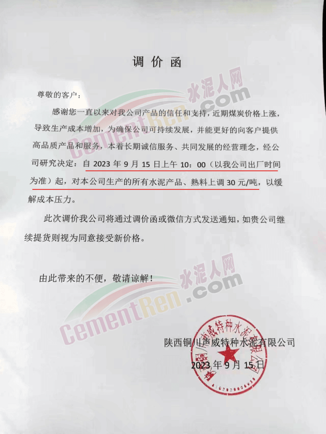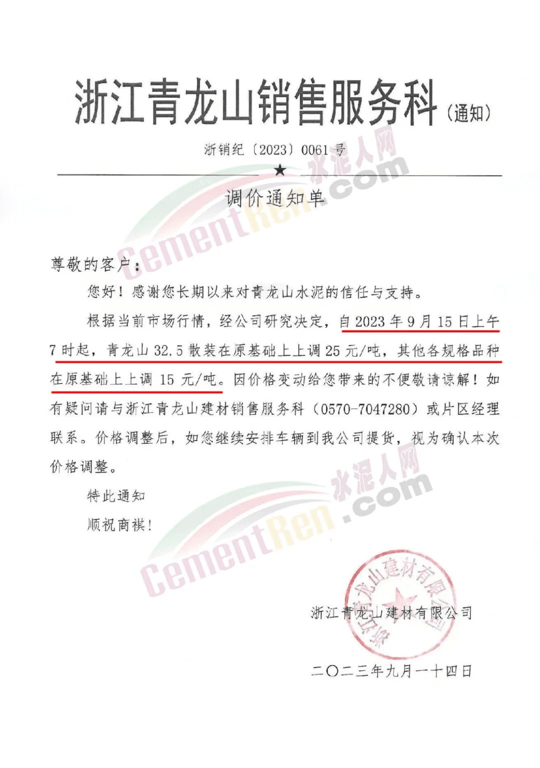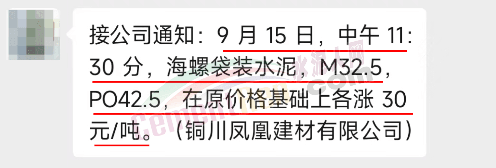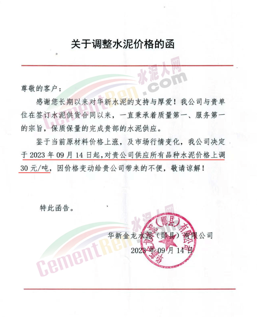 華新金龍水泥(鄖縣)有限公司通知,鑒于當(dāng)前原材料價(jià)格上漲,及市場(chǎng)行情變化,公司決定于2023年9月14日起所有品種水泥價(jià)格上調(diào)30元/噸。