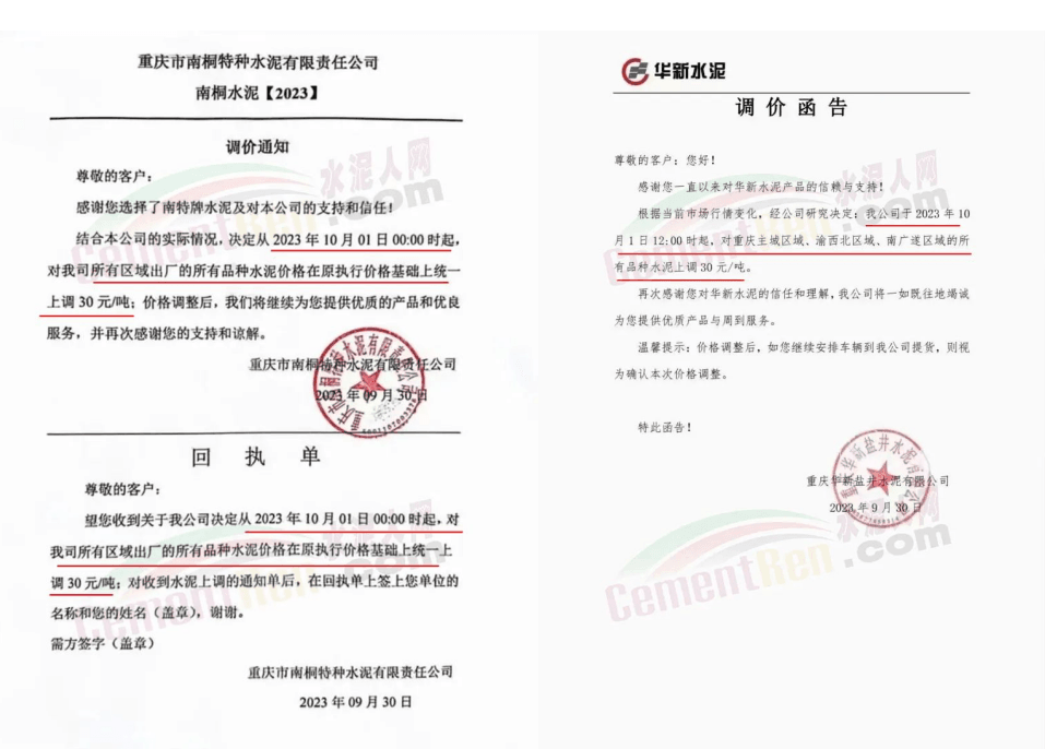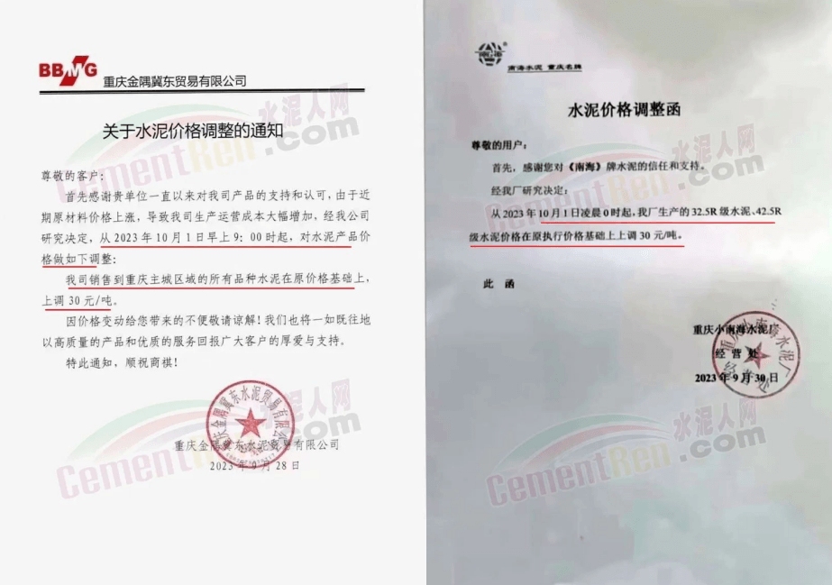 10月1日重慶金隅冀東、華新水泥、紅獅水泥、西南水泥渝西營銷中心等主要品牌企業通知,上調水泥價格30元/噸。