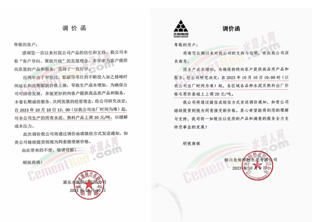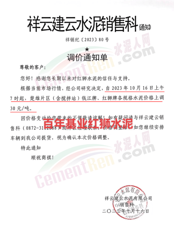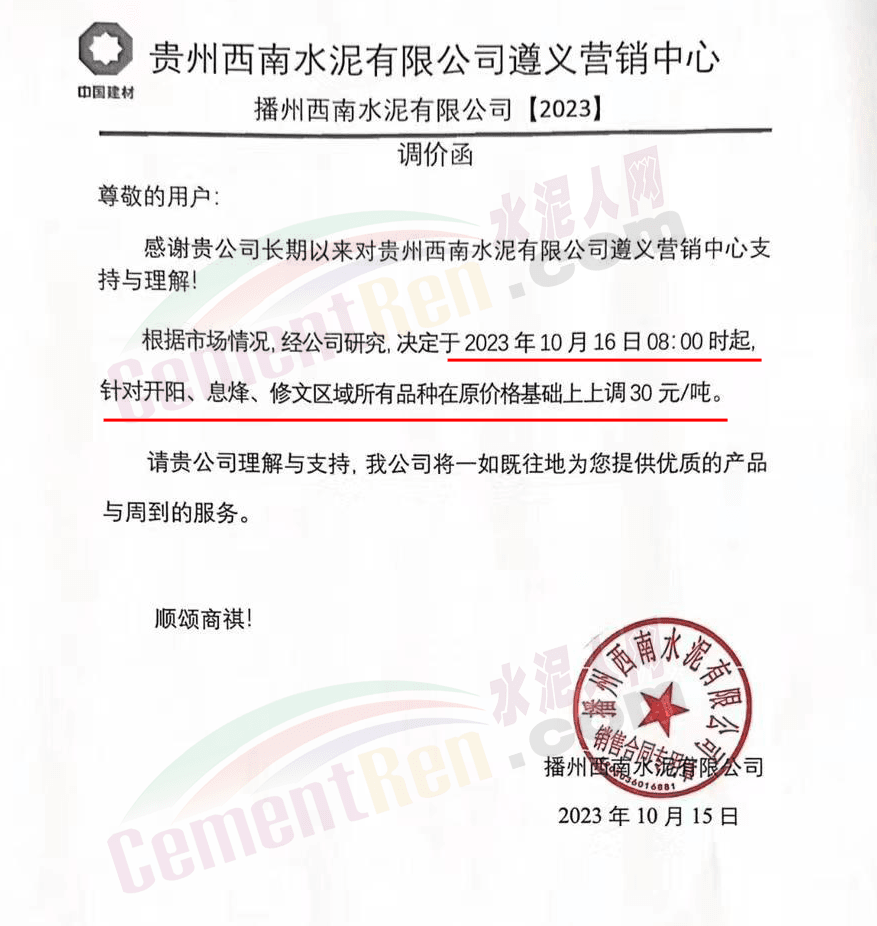 畢節(jié)賽德水泥有限公司通知,由于原材料價(jià)格持續(xù)上漲,導(dǎo)致公司生產(chǎn)成本增加,經(jīng)公司研究決定,自2023年10月16日零點(diǎn)起,對(duì)所有區(qū)域各品種水泥出廠價(jià)格在原有價(jià)格基礎(chǔ)上上調(diào)30元/噸。
