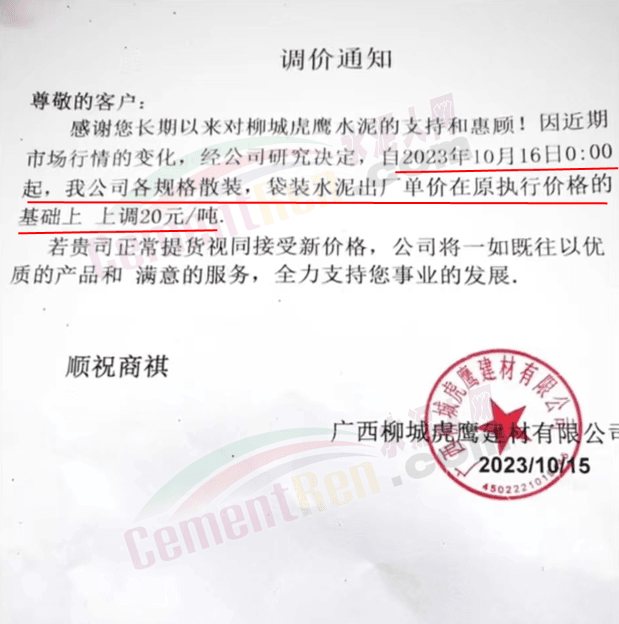 廣西柳城虎鷹建材有限公司通知,因近期市場(chǎng)行情的變化,經(jīng)公司研究決定,自2023年10月16日0時(shí)起,公司各規(guī)格散裝,袋裝水泥出廠單價(jià)在原執(zhí)行價(jià)格基礎(chǔ)上上調(diào)20元/噸。