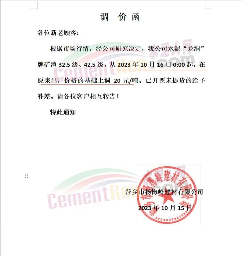 江西日江水泥制造有限公司通知,根據(jù)市場(chǎng)情況,經(jīng)研究決定自2023年10月15日上午9時(shí)起各標(biāo)號(hào)水泥價(jià)格上調(diào)20元/噸。