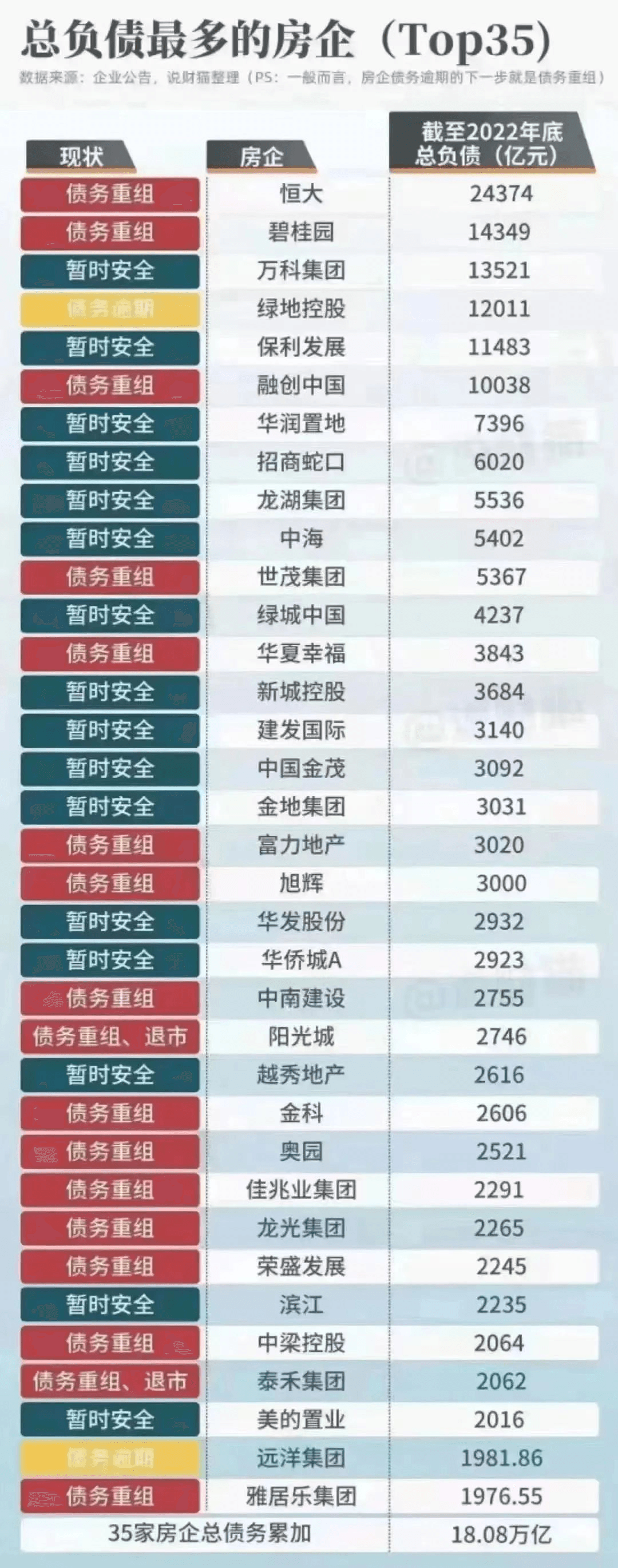 從碧桂園到融創(chuàng)再到綠地、華夏幸福、世茂地產(chǎn)、陽光城,統(tǒng)計數(shù)據(jù)顯示,中國房企排名前100中,53家已暴雷或正處于暴雷邊緣,房企前30強已經(jīng)暴雷20家,不知下一家會是誰。負債萬億的房企有4家,分別為,恒大、碧桂園、萬科、綠地控股,由此可見,就連一向以經(jīng)營穩(wěn)健著稱的萬科,目前也存在債務暴雷風險。