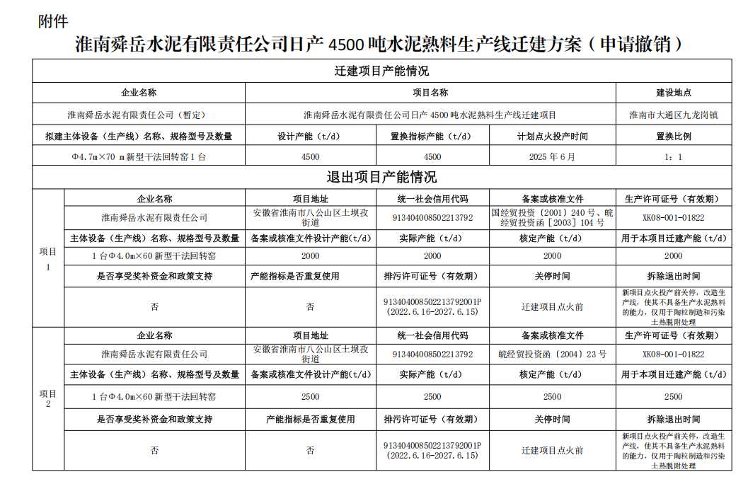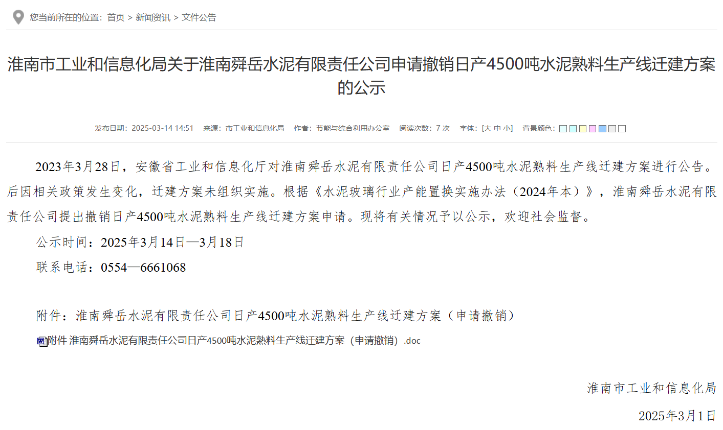日前,安徽淮南市工業和信息化局發布《關于淮南舜岳水泥有限責任公司申請撤銷日產4500噸水泥熟料生產線遷建方案的公示》稱,2023年3月28日,安徽省工業和信息化廳對淮南舜岳水泥有限責任公司日產4500噸水泥熟料生產線遷建方案進行公告。后因相關政策發生變化,遷建方案未組織實施。根據《水泥玻璃行業產能置換實施辦法(2024年本)》,淮南舜岳水泥有限責任公司提出撤銷日產4500噸水泥熟料生產線遷建方案申請?,F將有關情況予以公示,歡迎社會監督。公示時間:2025年3月14日—3月18日聯系電話:0554—6661068.