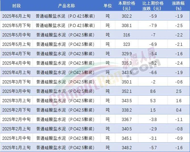 國家統(tǒng)計(jì)局?jǐn)?shù)據(jù)從另一側(cè)面印證崩盤趨勢,2025年6月上旬,P.O42.5散裝水泥全國均價(jià)跌至302.2元/噸,較年初暴跌46元,實(shí)現(xiàn)連續(xù)12期下跌,潰敗已成燎原之勢。