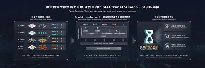 本次盤古預測大模型的關鍵升級點是,采用業界首創的triplet transformer統一預訓練架構,將不同行業的數據,包括工藝參數的表格數據,設備運行日志的時間序列數據,產品檢測的圖片數據進行統一的三元組編碼,并在同一框架內高效處理和預訓練,極大地提升預測大模型的精度,并大幅提升跨行業、跨場景的泛化性。