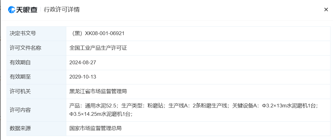 根據(jù)工信部公開(kāi)信息顯示,雞西賽龍水泥制造有限公司2019年10月14日辦的生產(chǎn)許可證中許可類(lèi)型為粉磨站,關(guān)鍵設(shè)備為Φ3.2×13m水泥磨機(jī)1臺(tái);Φ3.5×14.25m水泥磨機(jī)1臺(tái)。在許可內(nèi)容之內(nèi)并沒(méi)有關(guān)于水泥熟料生產(chǎn)線。