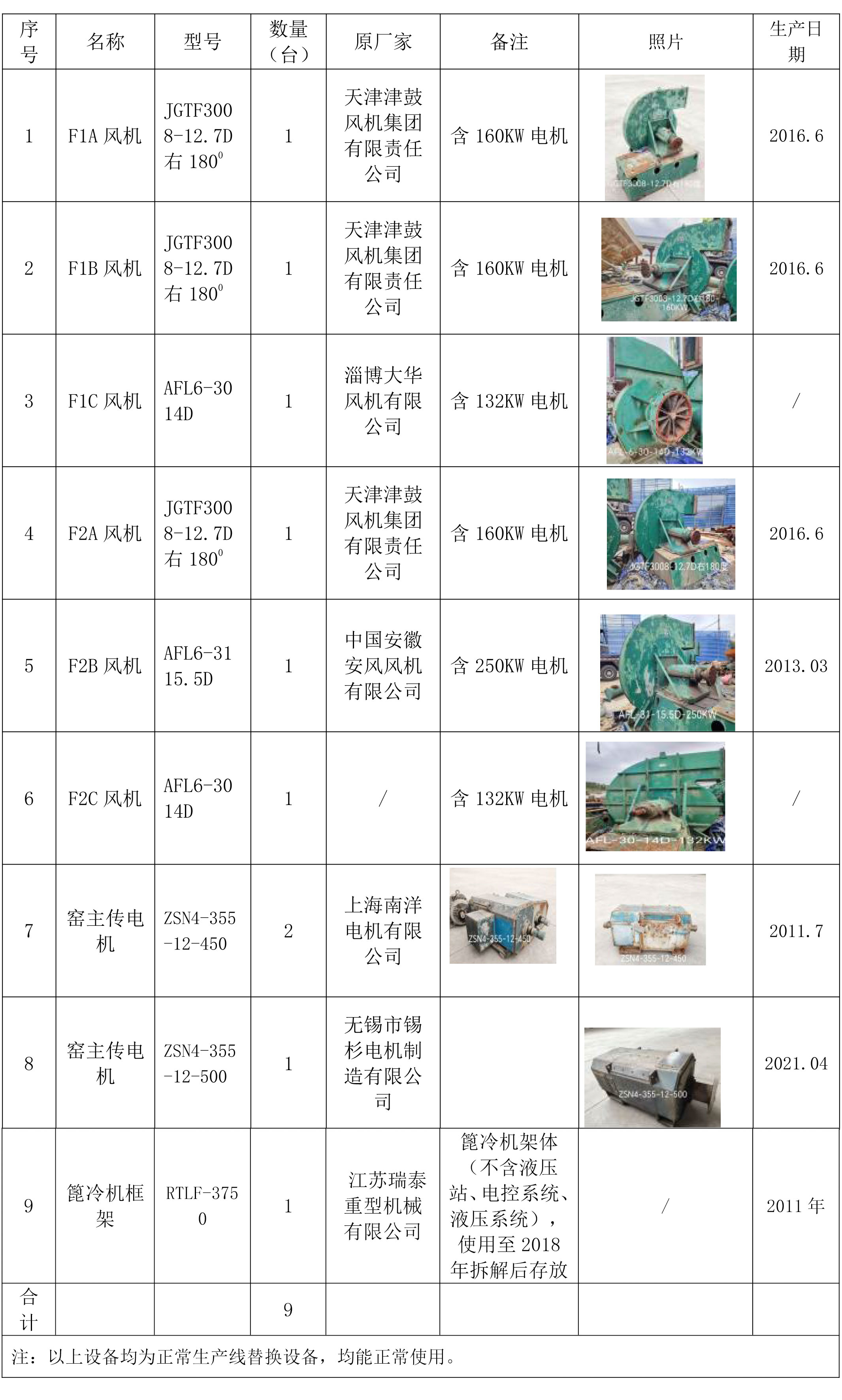 一、外賣處理內容:閑置回轉窯主傳電機、篦冷機風機、篦冷機框架。技術參數以及外賣范圍詳見附件。