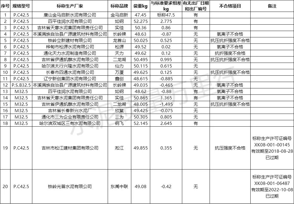 更值得警惕的是,部分產(chǎn)品存在“多重不合格”問題。例如本溪滿族自治縣廣源建筑材料有限公司生產(chǎn)的“長嶺”牌P.C42.5、P.S.B32.5各一批次產(chǎn)品,不僅氯離子不合格,同時存在袋重不足;四平佳潤水泥有限公司的一批次“如鋼”牌M32.5水泥也出現(xiàn)氯離子超標(biāo)與袋重不足并存的情況,這類產(chǎn)品的質(zhì)量風(fēng)險更為集中。