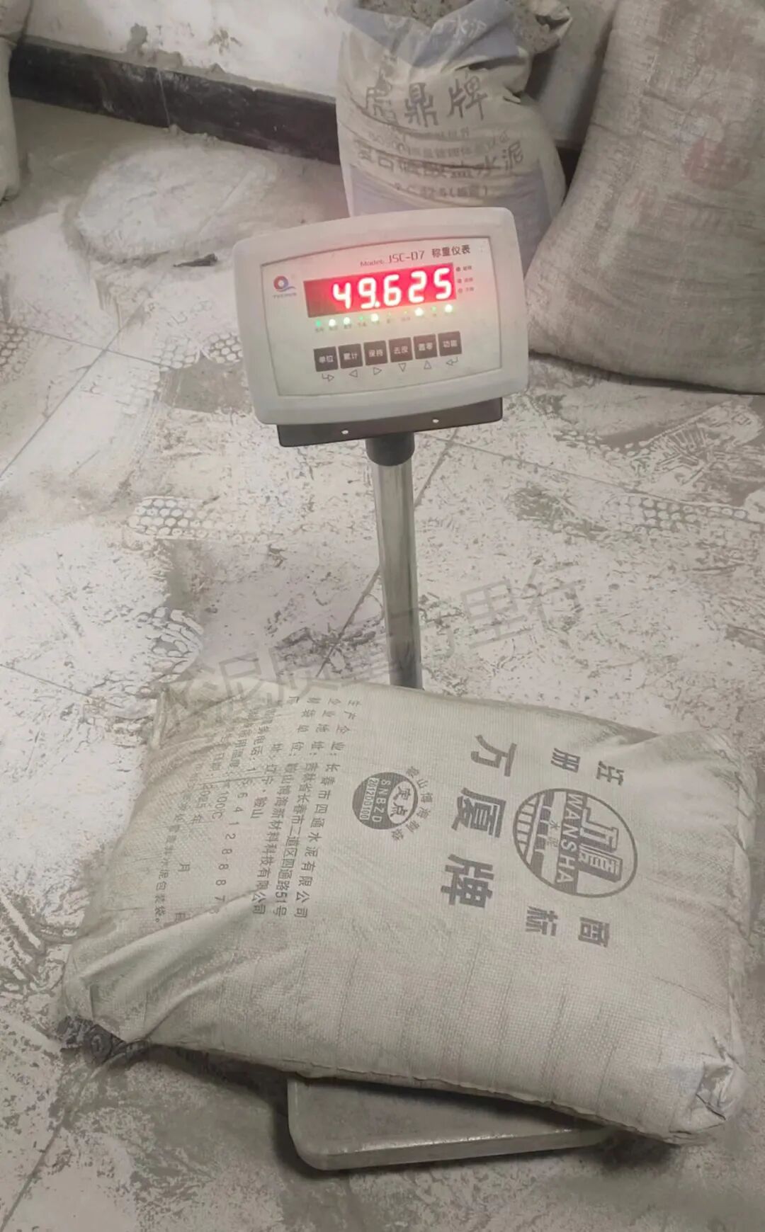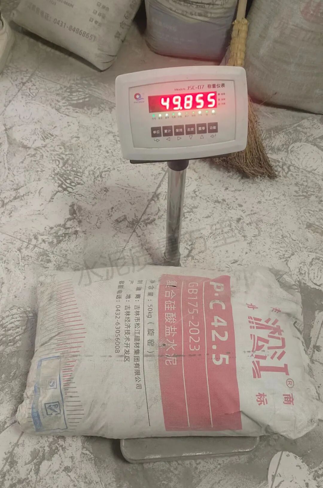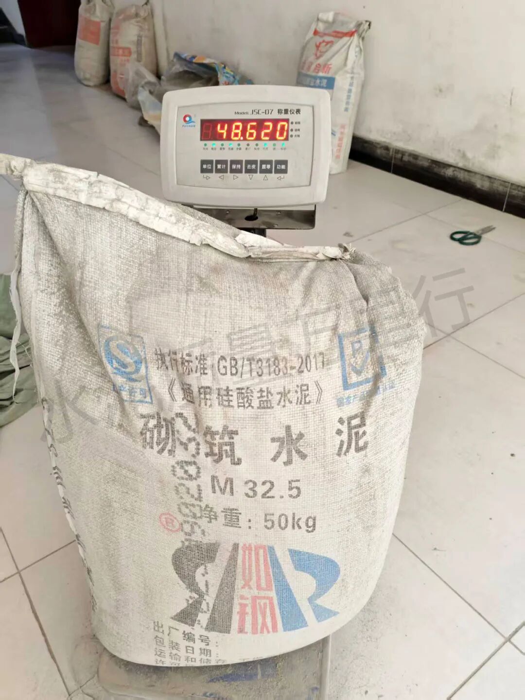 吉林省長春新興水泥廠“欣業(yè)”牌M32.5標(biāo)稱50kg實測47.565kg、47.650kg、48.805kg、49.425kg、49.355kg